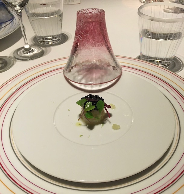 まずアペタイザーとしてキャビアが載せられた海老のマリネから始まりましたが、富士山に見立てたグラスを蓋にして運んできたのがニクい。こういう日本的な演出は海外からのお客にも喜ばれそう。