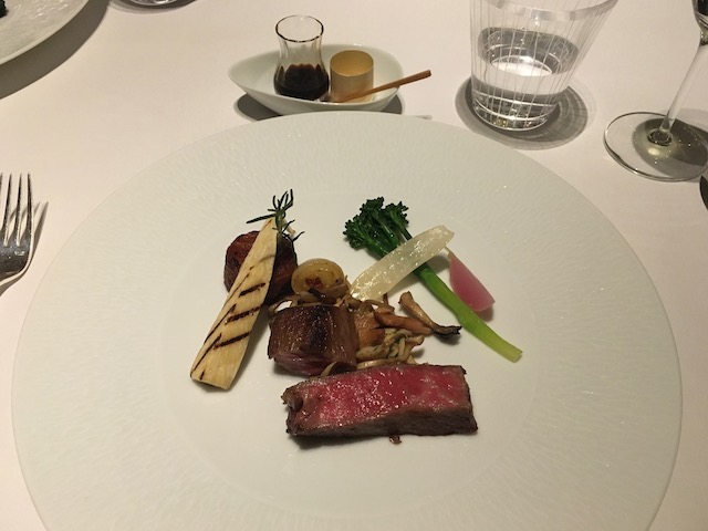 また、次に出てきたコンソメスープも、日本的な「出汁」をぎゅっと詰め込んだ濃厚なスープ…というか本当に旨みの詰まった出汁を飲むような感触。それからメインの魚料理、肉料理へ。肉料理は「赤ワインソース」か「わさび醤油」か選ぶことが出来たので、わさび醤油を選択。脂身もよく入った肉にわさびを合わせるとギュッと味が引き締まり、これぞ日本流フレンチの醍醐味といった感じがします。