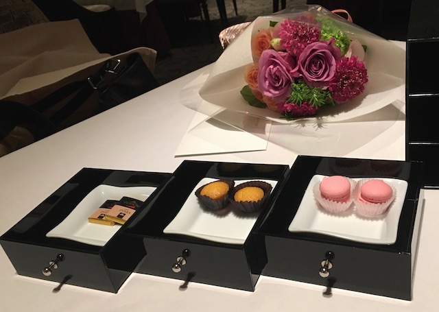 友人と久々の再会を喜びつつ、早速シャンパンで乾杯。「アニバーサリープラン」を事前予約し、シャンパンとお祝いデザート、ブーケが既に付いているコースにしていました。一時帰国前にお祝い品など準備する時間も無かったので、本当にこういう気の利いたサービスは有難い。