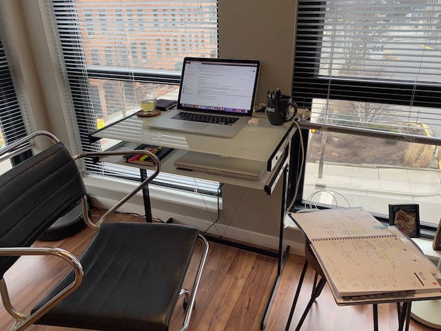 まず最初の頃、とりあえずラップトップを持って帰ってもともと持っていた小さなデスクで仕事。
